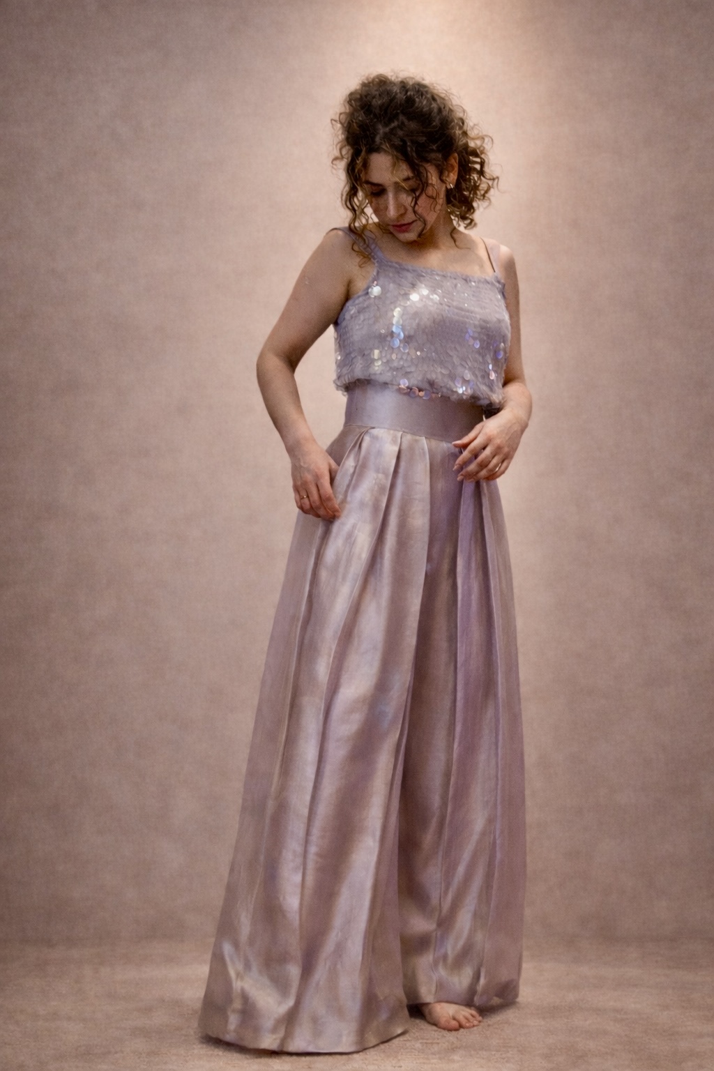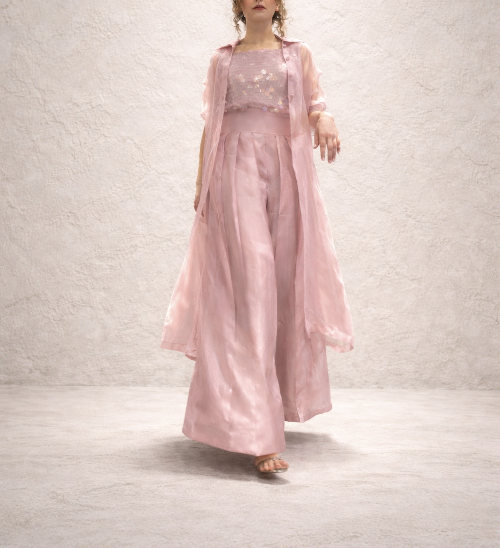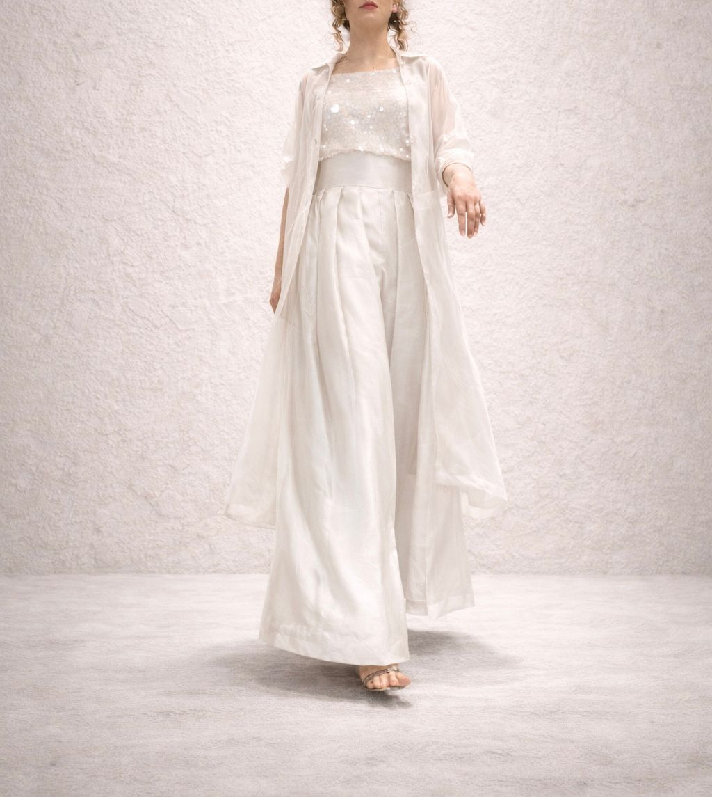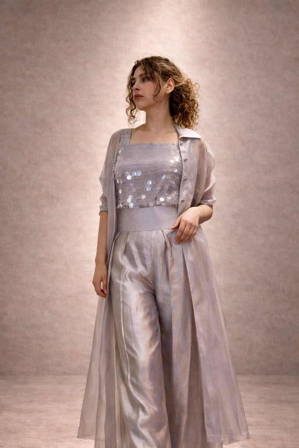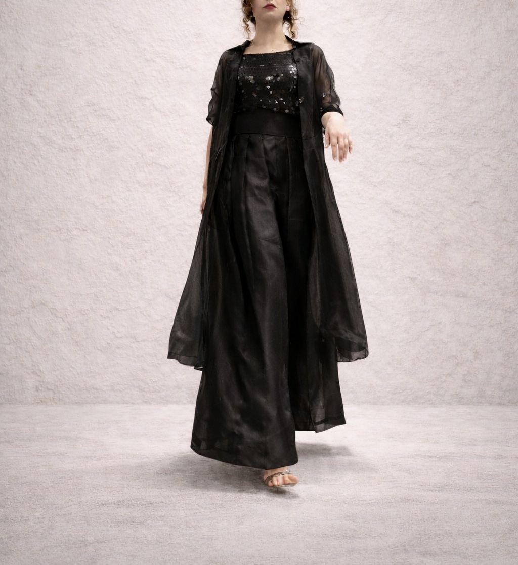 In soft grey, Elara balances structure and light. A sequin-adorned shirt is paired with high-waisted pleated sheesha silk trousers, layered beneath an airy organza jacket. Distinct yet effortless, Elara is made for moments that call for presence without excess.