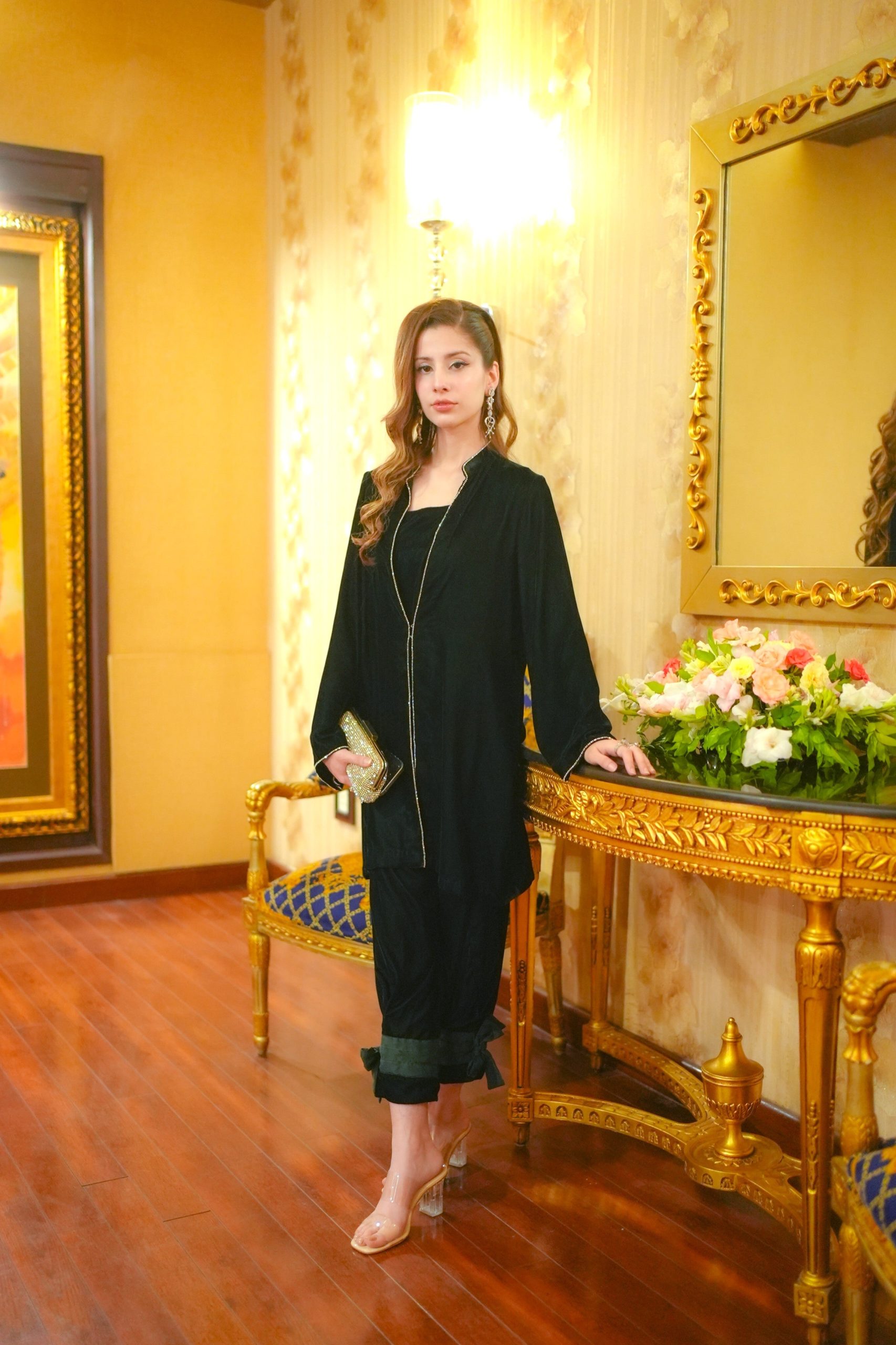 Handle with care — dry clean only. Avoid folding for long periods and store in a cool, airy space to preserve the velvet’s natural sheen and texture.