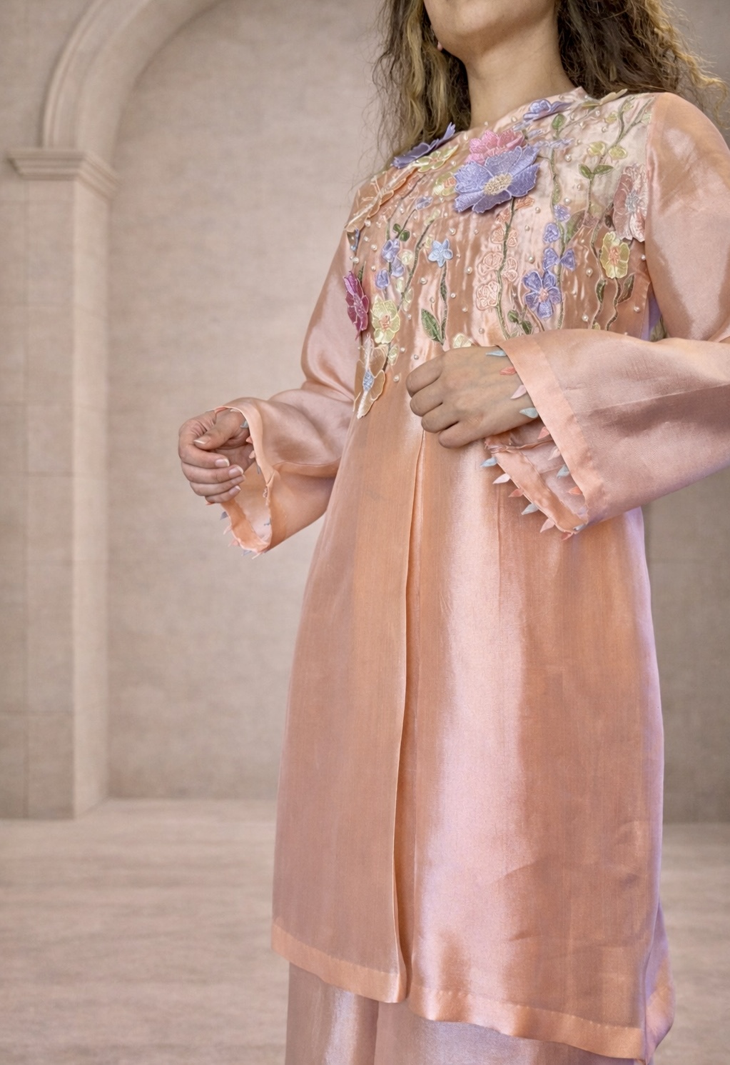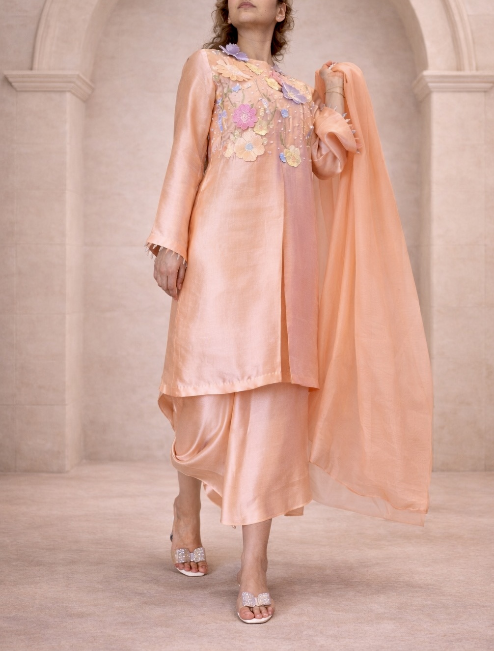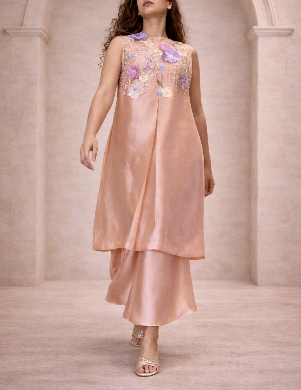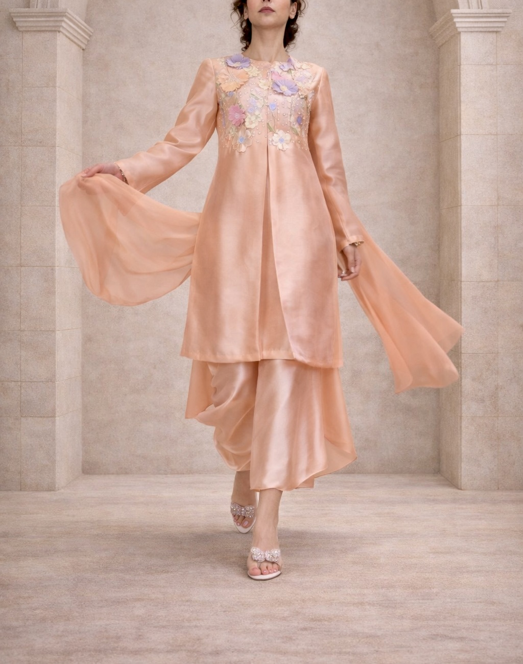 Draped in a luminous peach-blush hue, Soraya is where softness meets statement. The flowing silk silhouette moves like liquid light, paired with delicately flared trousers that add graceful dimension.