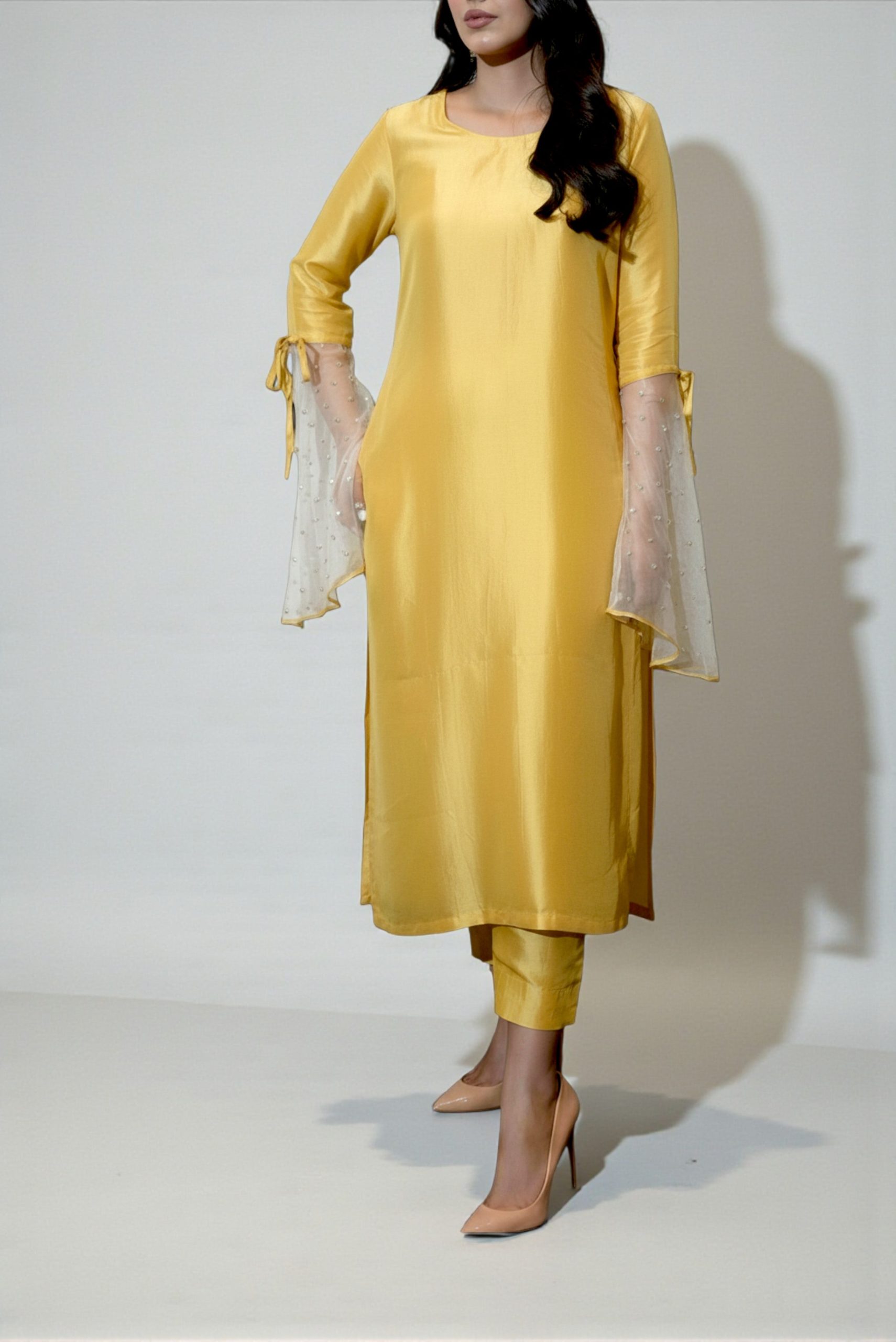 Like a marigold in morning bloom, Zaria is where silk meets sunlight—a dress crafted in golden breath, made for days touched by warmth and grace. Pure organza bell sleeves and scattered Swarovski bring a soft, glistening radiance — quietly luminous, eternally graceful.
